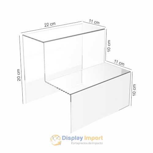 Este exhibidor acrílico escalonado es ideal para mostrar calzado, accesorios o productos pequeños de forma ordenada y elegante. Su estructura de dos niveles permite optimizar el espacio de exhibición y mejora la visibilidad de cada producto.