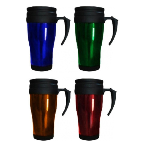 Jarro Mug de plástico de color traslucido y tapa negra. Capacidad 450 ml