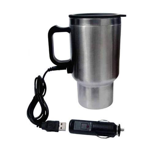 - Descripción: Jarro metálico de 450 ml. Con tapa de plástico con retén para evitar pérdidas y cable de conexión USB, con adaptador para auto, para mantener el calor.