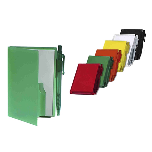 Libreta de plástico con taco de hojas blancas mas lapicero. Medida 7 x 10.5 cm