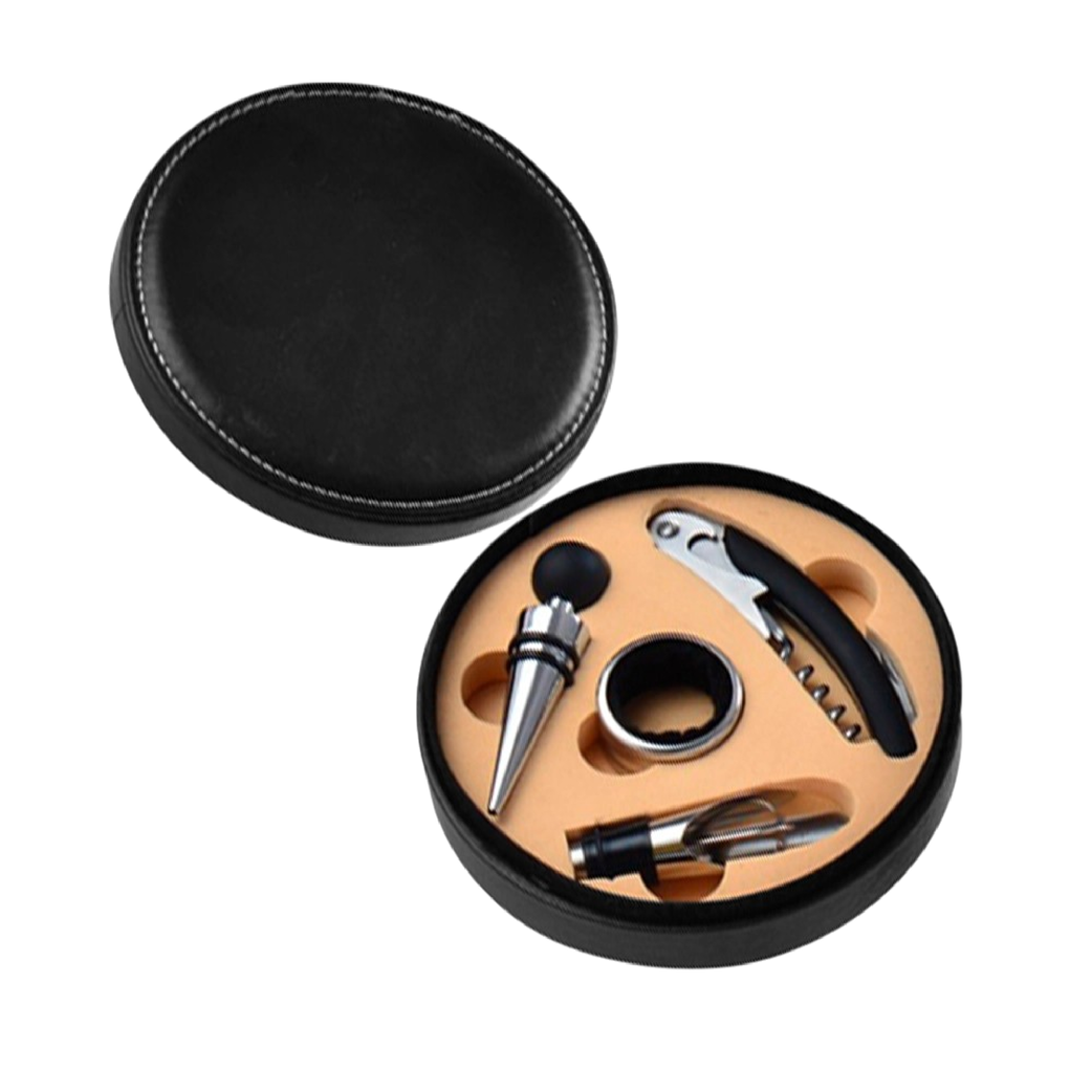 Un detalle con estilo para los amantes del vino. Este elegante set incluye todo lo necesario para una experiencia completa: sacacorchos, tapón, anillo antigoteo y pico vertidor, organizados en un estuche redondo de biocuero color negro que combina practicidad y sofisticación.
